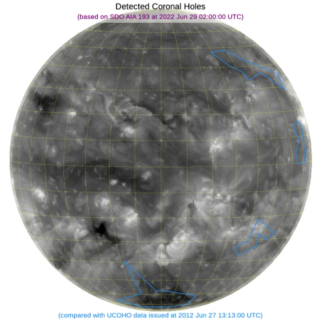 現時点で地球正面の黒点群は3042,3043,3044です。←黒点番号が振られていない活動領域でもフレアは発生しますので、あくまで目安として捉えてください。