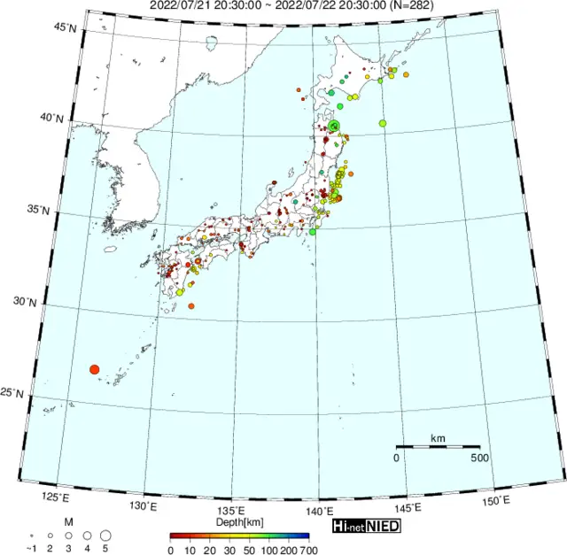 ●Hi-net日本地震分布と気象庁・・・hi-netの小笠原のデータは掲載日がずれて反映されるようです(翌々日に掲載)。掲載されないものもあるようなので気象庁の画像も付けます