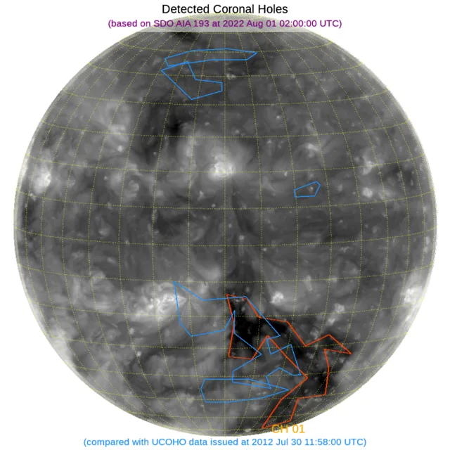 南の極の付近から、南半球(高緯度)西寄り~西側にかけて広がるコロナホールがありあす