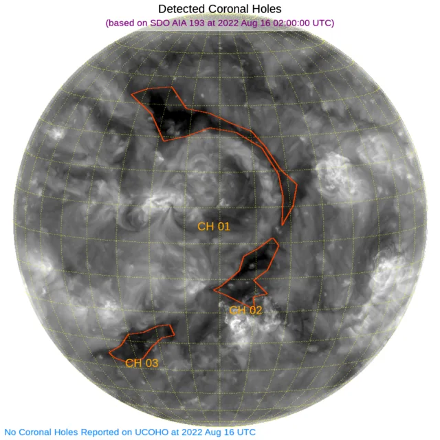 北半球東側から赤道付近西よりを経て南半球中心付近にかけて弧を描くコロナホールと、南半球東側にコロナホールがあります