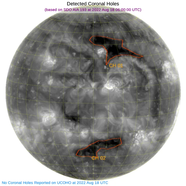 北半球西よりと南半球(高緯度)中心付近にコロナホールがあります