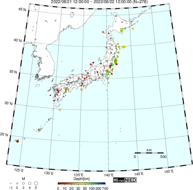 ●Hi-net日本地震分布と気象庁・・・hi-netの小笠原のデータは掲載日がずれて反映されるようです(翌々日に掲載)。掲載されないものもあるようなので気象庁の画像も付けます