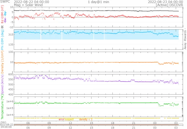 一時590km/s前後まで上がりましたが徐々に下がり、現在は520km/s前後で推移しています