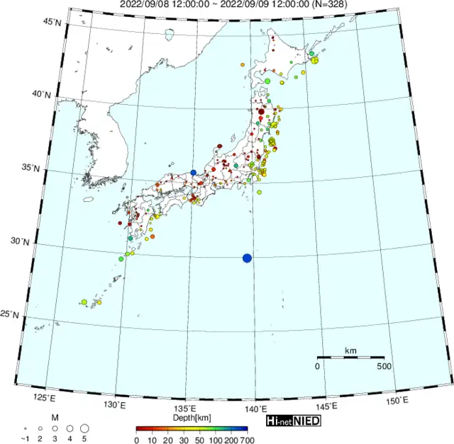 ●Hi-net日本地震分布と気象庁・・・hi-netの小笠原のデータは掲載日がずれて反映されるようです(翌々日に掲載)。掲載されないものもあるようなので気象庁の画像も付けます