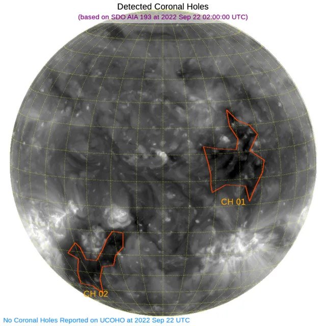 南半球(高緯度)東端と赤道付近西寄りにコロナホールがあります