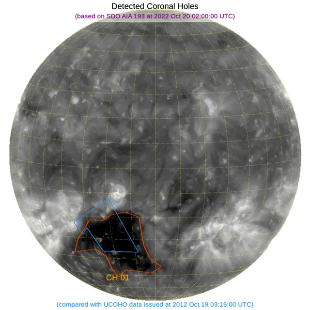 南の極付近にコロナホールがあります