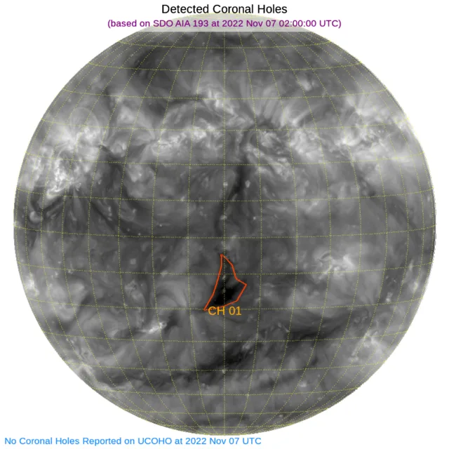 赤道付近やや南の中心付近に小さなコロナホールがあります