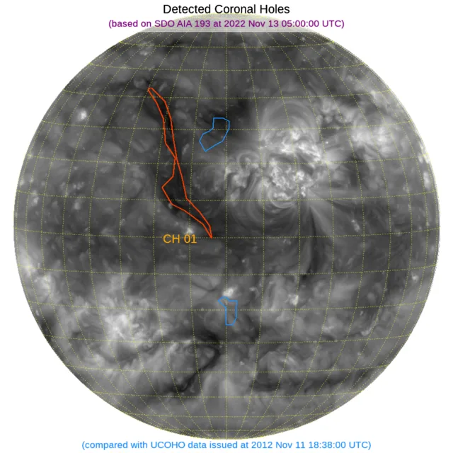 北半球東寄りに南北に細長いコロナホールがあります