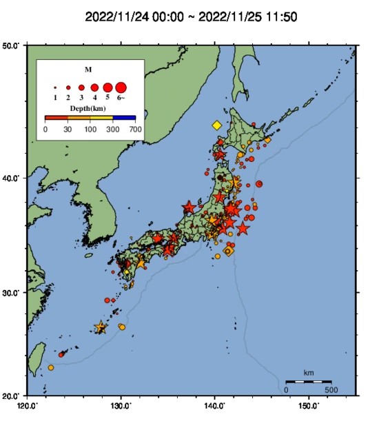 ●Hi-net日本地震分布と気象庁・・・hi-netの小笠原のデータは掲載日がずれて反映されるようです(翌々日に掲載)。掲載されないものもあるようなので気象庁の画像も付けます