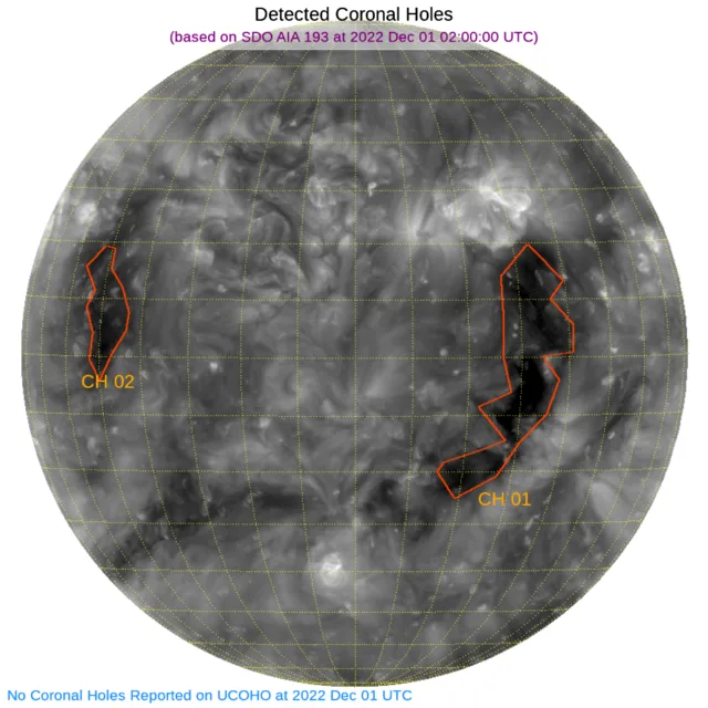 中心付近やや西よりから南半球(やや高緯度)中心付近に南北に広がるコロナホールがあります