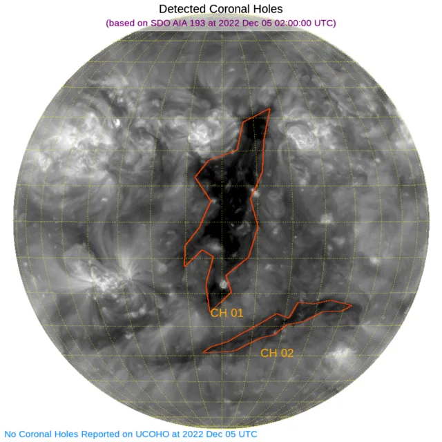 赤道を挟んで南北に長いコロナホールが中心付近にあります。南半球西側にもコロナホールがあります