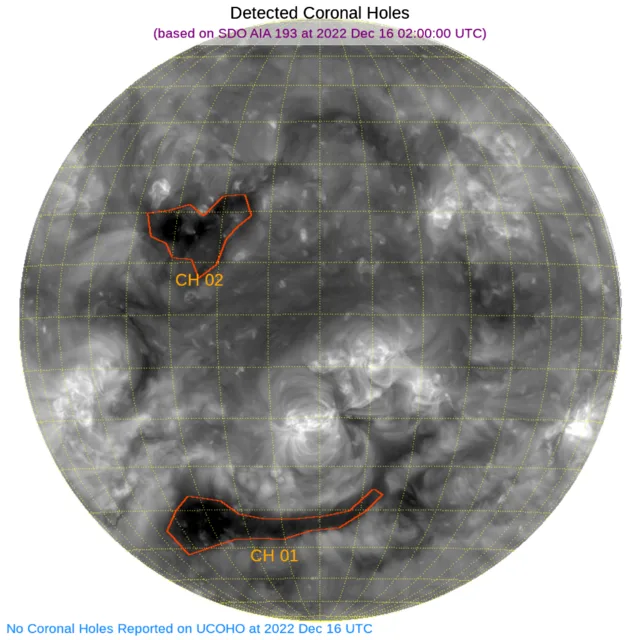 北半球東側と南半球(高緯度)東端~中心付近にかけてコロナホールがあります
