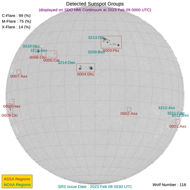 現時点で地球正面の黒点群は3213,3214です。←黒点番号が振られていない活動領域でもフレアは発生しますので、あくまで目安として捉えてください。