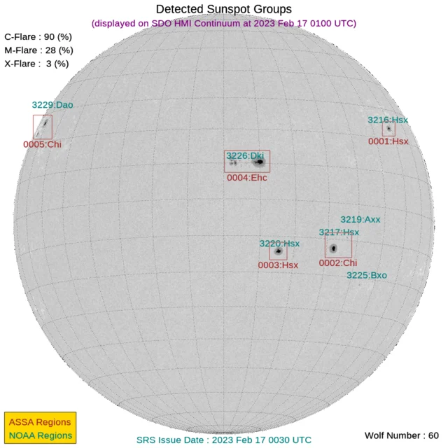 現時点で地球正面の黒点群は3220、3226です。←黒点番号が振られていない活動領域でもフレアは発生しますので、あくまで目安として捉えてください。