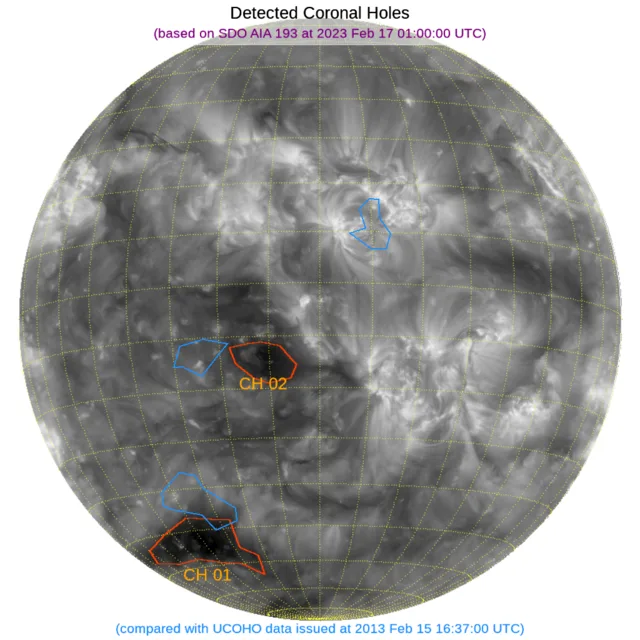 南半球東寄り、南の極の近くに小さなコロナホールがあります