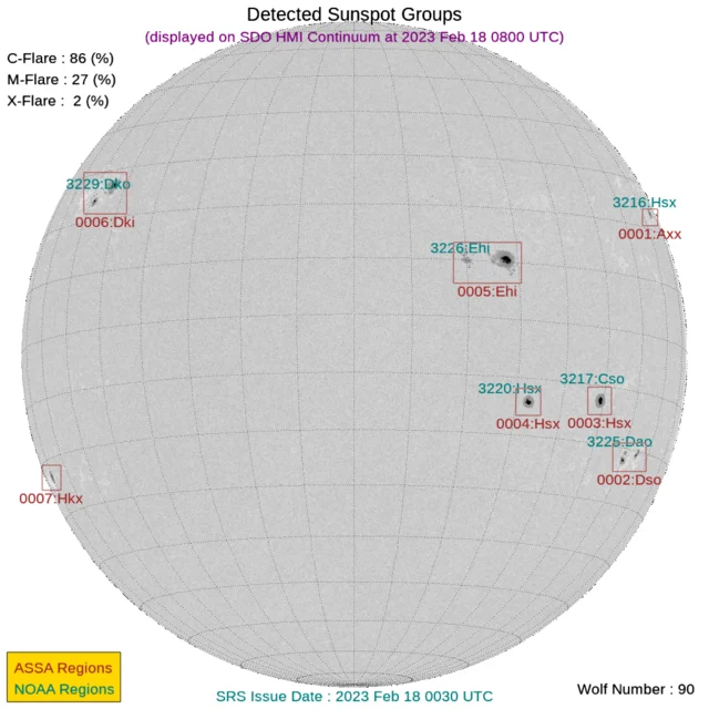 現時点で地球正面の黒点群は3226です。←黒点番号が振られていない活動領域でもフレアは発生しますので、あくまで目安として捉えてください。