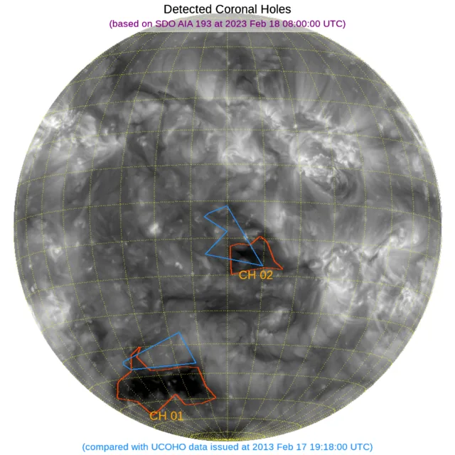 南半球西寄り、南の極の近くに小さなコロナホールがあります