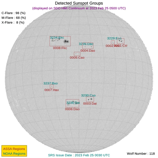 現時点で地球正面の黒点群は3230,3234,3235,3236,3237です。←黒点番号が振られていない活動領域でもフレアは発生しますので、あくまで目安として捉えてください。