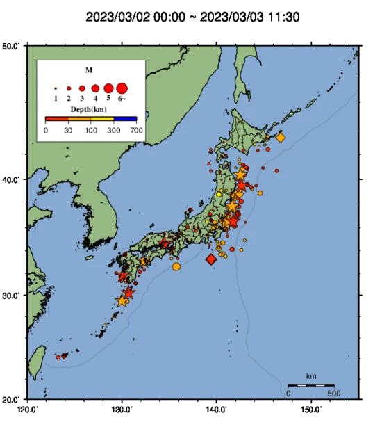 ●Hi-net日本地震分布と気象庁・・・hi-netの小笠原のデータは掲載日がずれて反映されるようです(翌々日に掲載)。掲載されないものもあるようなので気象庁の画像も付けます