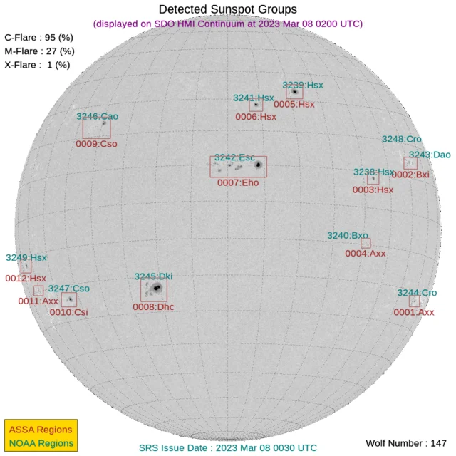 現時点で地球正面の黒点群は3241,3242,3245です。←黒点番号が振られていない活動領域でもフレアは発生しますので、あくまで目安として捉えてください。