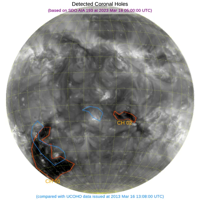 赤道付近やや南の西よりと南半球東端にコロナホールがあります
