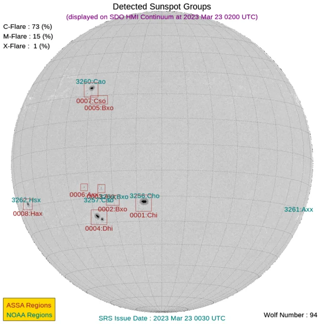 現時点で地球正面の黒点群は3256,3259です。←黒点番号が振られていない活動領域でもフレアは発生しますので、あくまで目安として捉えてください。