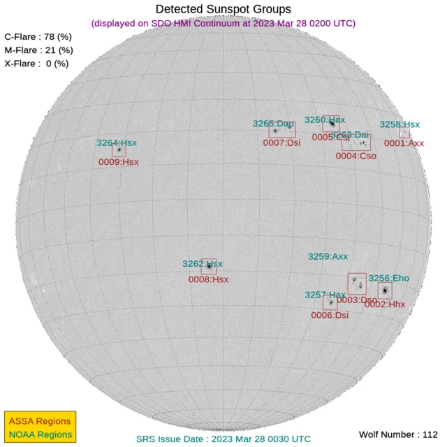 現時点で地球正面の黒点群は3262,3265です。←黒点番号が振られていない活動領域でもフレアは発生しますので、あくまで目安として捉えてください。