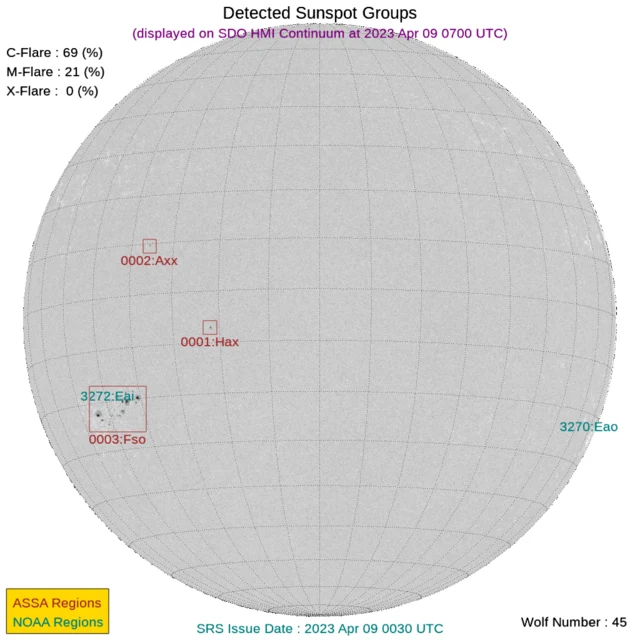現時点で地球正面の黒点群はありません。←黒点番号が振られていない活動領域でもフレアは発生しますので、あくまで目安として捉えてください。