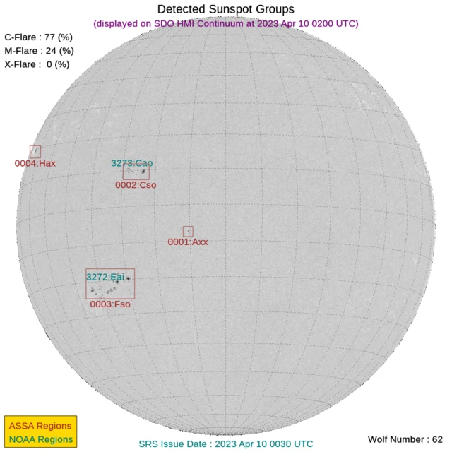 現時点で地球正面の黒点群はありません。←黒点番号が振られていない活動領域でもフレアは発生しますので、あくまで目安として捉えてください。