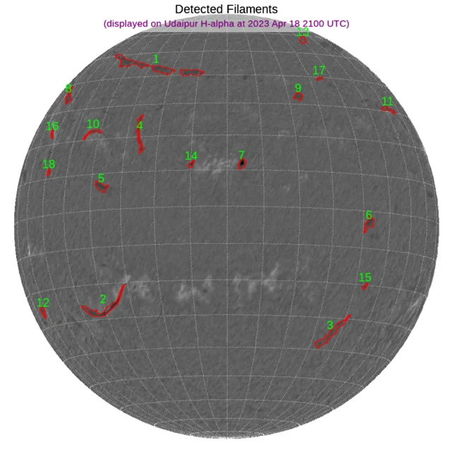 北半球(やや高緯度)を中心に、南半球にもフィラメントがあります