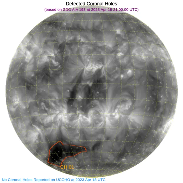 南半球(高緯度)東端~中心付近近くにコロナホールがあります