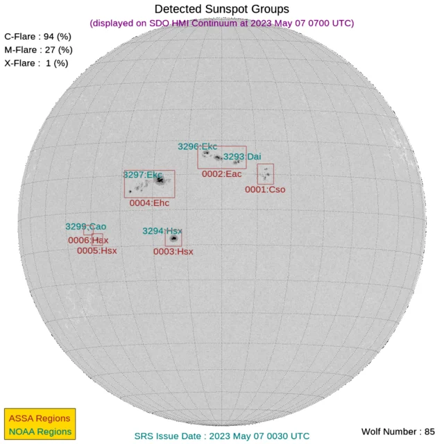 現時点で地球正面の黒点群は3293,3294,3296です。←黒点番号が振られていない活動領域でもフレアは発生しますので、あくまで目安として捉えてください。