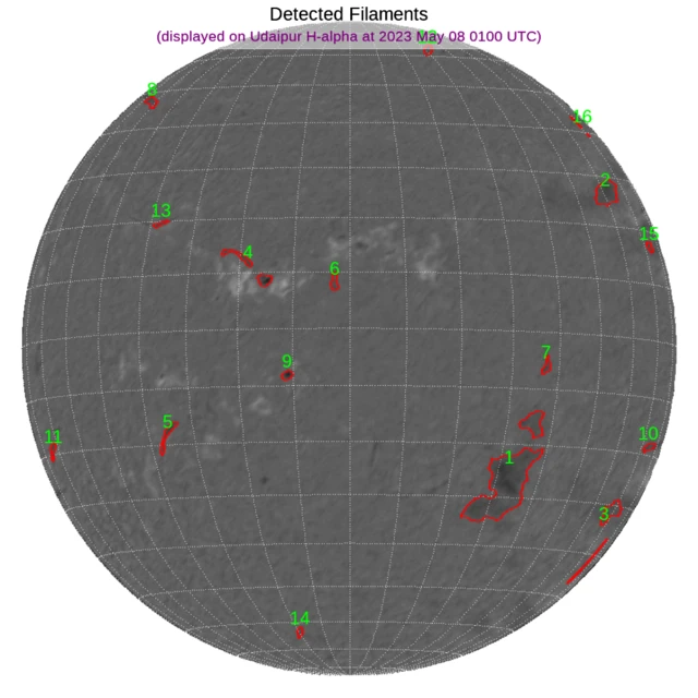 東寄り、東端、西端にフィラメントがありますが、南半球西側のフィラメントは大きめ