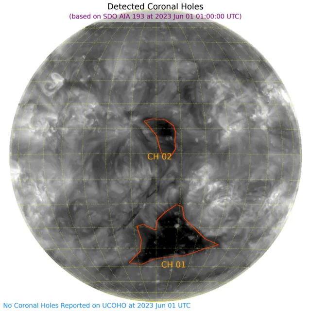 赤道付近中心付近、南半球(やや高緯度)中心付近にコロナホールがあります