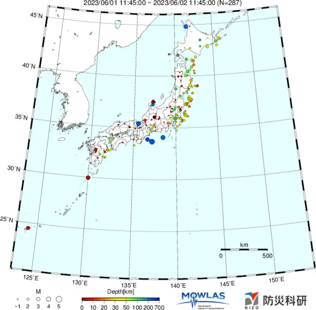 ●Hi-net日本地震分布と気象庁・・・hi-netの小笠原のデータは掲載日がずれて反映されるようです(翌々日に掲載)。掲載されないものもあるようなので気象庁の画像も付けます