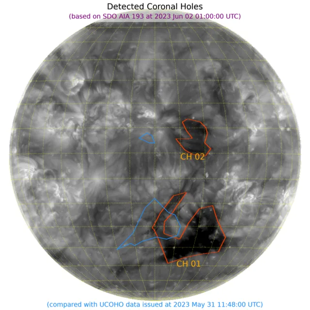 赤道付近西より、南半球(やや高緯度)西よりにもコロナホールがあります