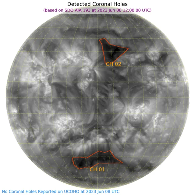 北半球西よりと南半球の中心付近にコロナホールがあります