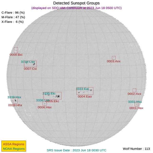 現時点で地球正面の黒点群は[3333, 3335]です。←黒点番号が振られていない活動領域でもフレアは発生しますので、あくまで目安として捉えてください