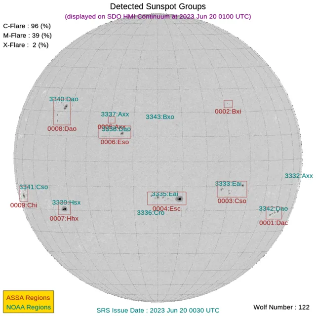 現時点で地球正面の黒点群は[3335, 3336, 3337, 3338, 3343]です。←黒点番号が振られていない活動領域でもフレアは発生しますので、あくまで目安として捉えてください。