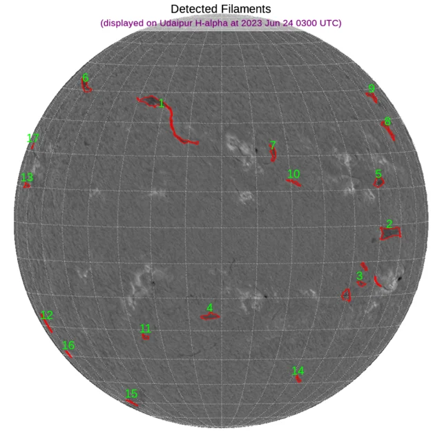 西端、北半球西より、東寄りに長めのフィラメント、南半球東側の領域と東端にフィラメントが散在しています