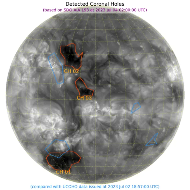 北半球東寄り、赤道付近東寄り、南半球(高緯度)東側にコロナホールがあります