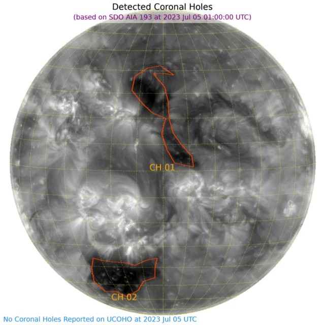 北半球赤道付近から中緯度にかけて中心付近にコロナホールがあります