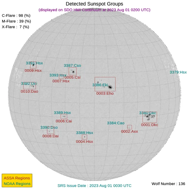 現時点で地球正面の黒点群は[3384, 3386, 3387, 3388, 3389]です。←黒点番号が振られていない活動領域でもフレアは発生しますので、あくまで目安として捉えてください。