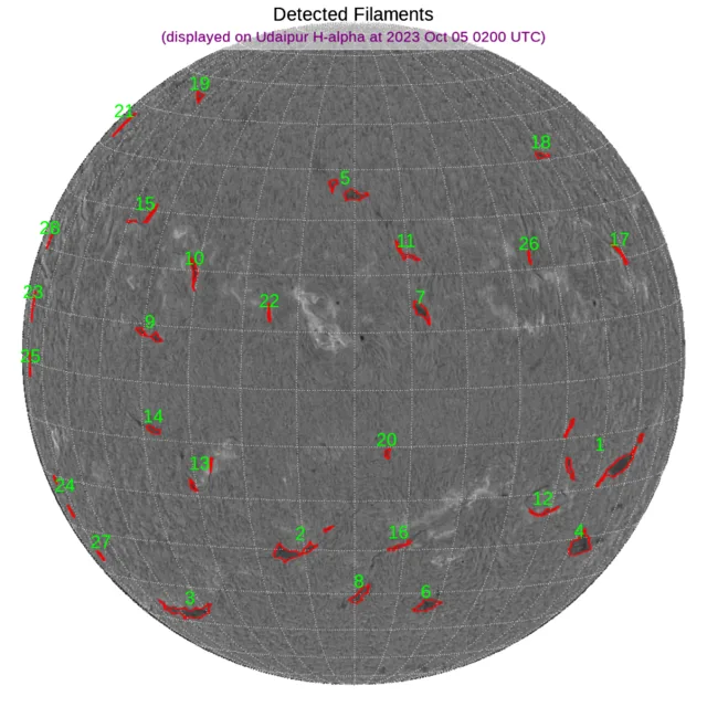 両極と赤道付近西側以外の領域にフィラメントがあります
