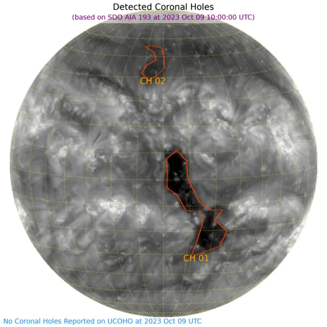 北半球(高緯度)東寄り、中心付近から南半球西よりにかけてのびるコロナホールがあります