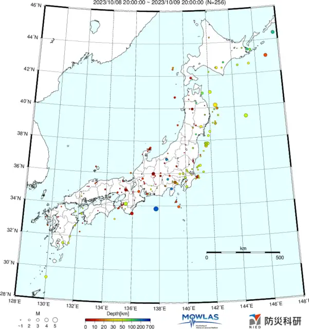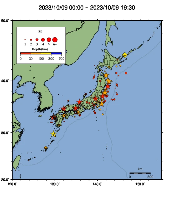 ●Hi-net日本地震分布と気象庁・・・hi-netの小笠原のデータは掲載日がずれて反映されるようです(翌々日に掲載)。掲載されないものもあるようなので気象庁の画像も付けます