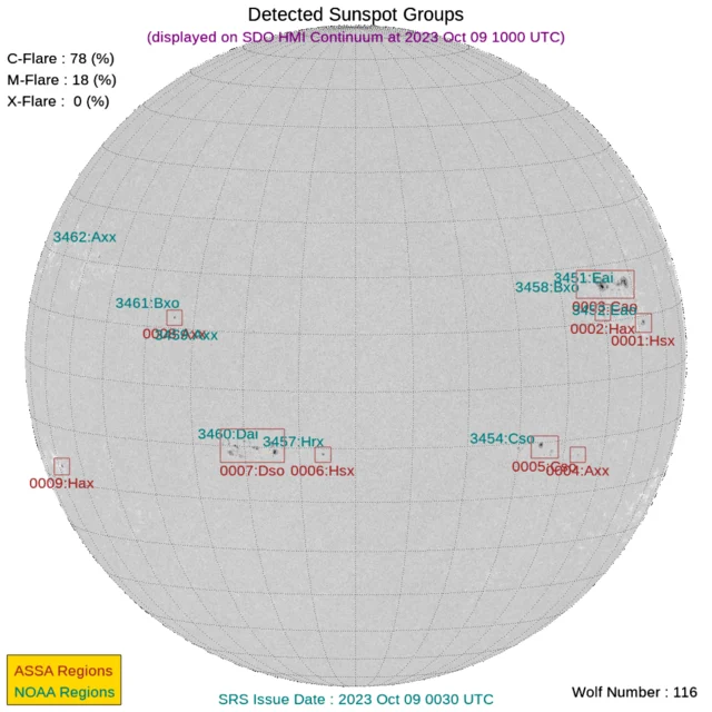 現時点で地球正面の黒点群は[3457, 3460]です。←黒点番号が振られていない活動領域でもフレアは発生しますので、あくまで目安として捉えて ください。