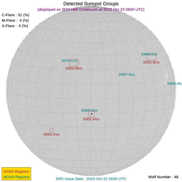 現時点で地球正面の黒点群は[3468, 3470]です。←黒点番号が振られていない活動領域でもフレアは発生しますので、あくまで目安として捉えてください。