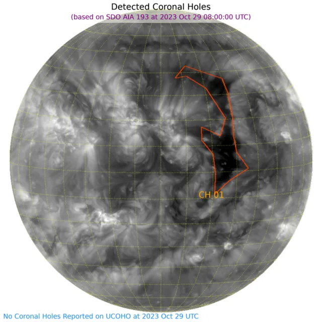 北半球赤道付近から北半球西側にかけて南北にやや長いコロナホールがあります