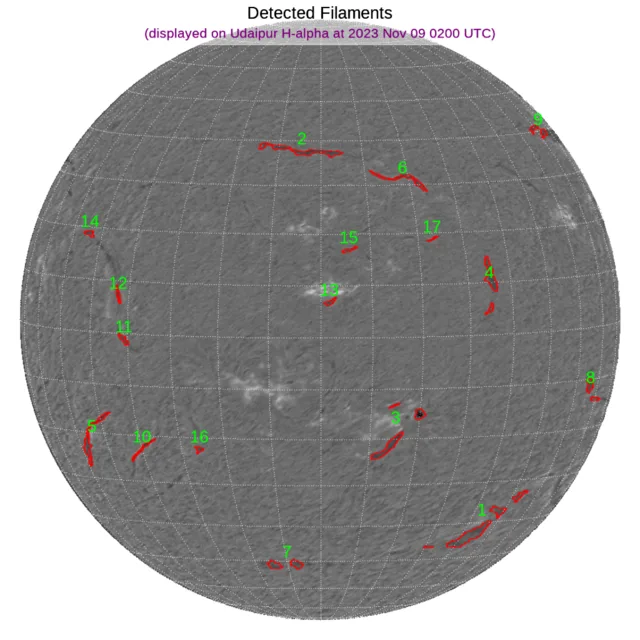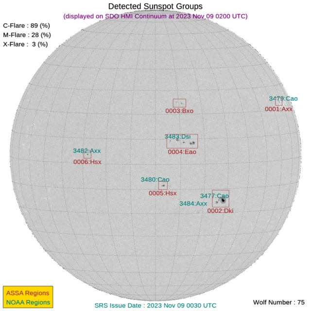 現時点で地球正面の黒点群は[3483, 3484]です。←黒点番号が振られていない活動領域でもフレアは発生しますので、あくまで目安として捉えてください。